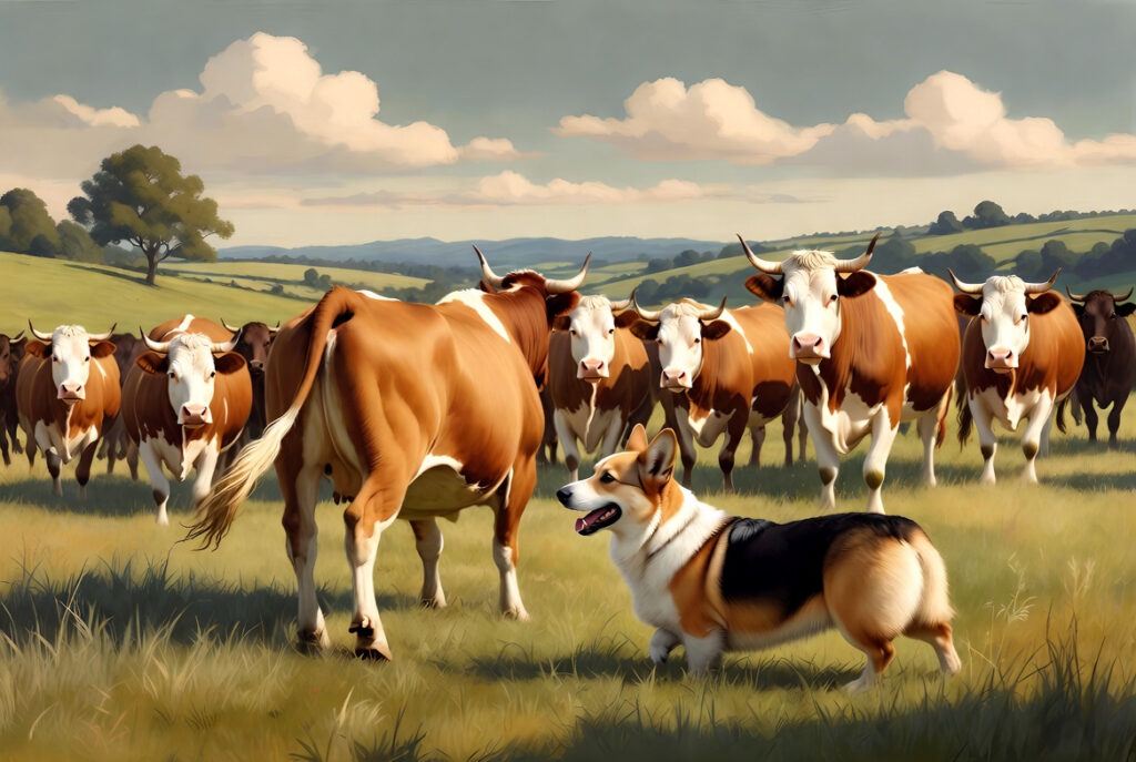 「牧羊犬」というと羊を追うイメージがありますが、コーギーが主に相手にしていたのは牛でした。羊やポニーを追うこともありましたが、特に牛の管理を得意としていたのです。